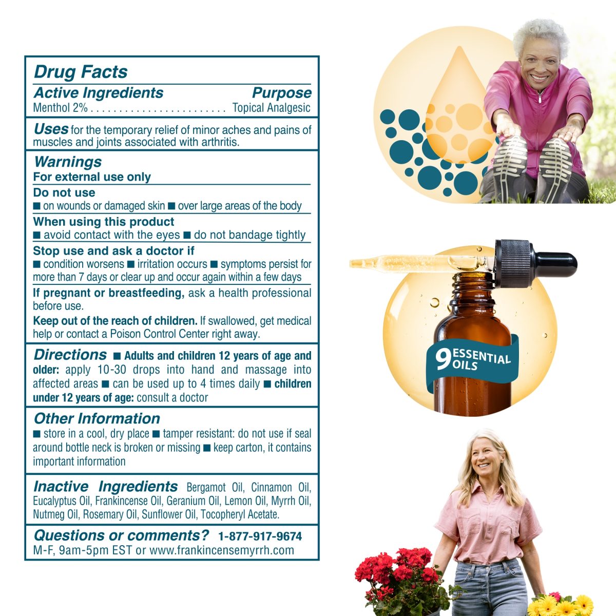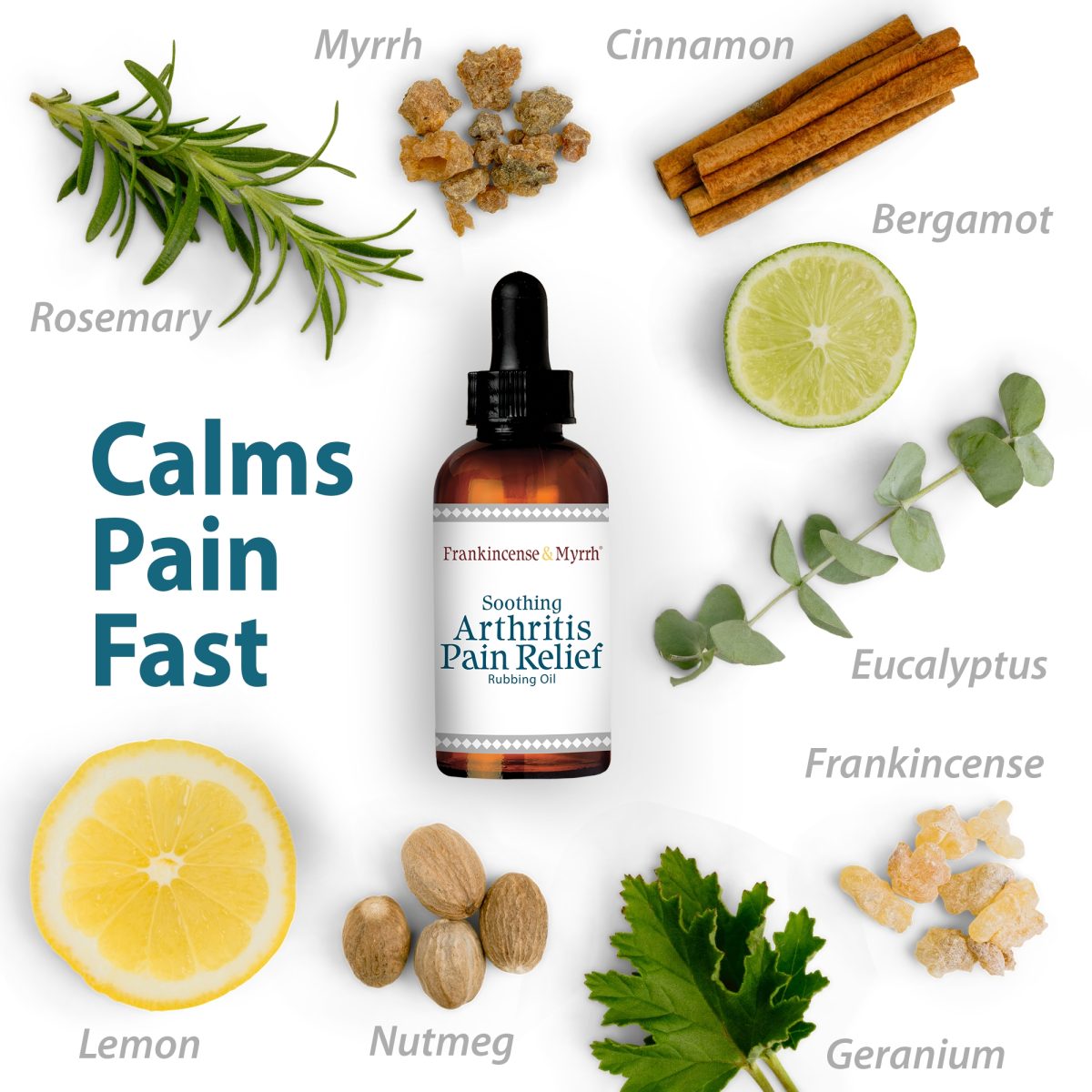 When your muscles and joints hurt too much to do the things you love, it’s time to give Frankincense & Myrrh’s Arthritis Pain Relief rubbing oil a try. The powerful, easy to apply rubbing oil penetrates quickly to relieve pain, stiffness, and inflammation at the source, easing muscle, joint and tendon pain in your hands, wrists, elbow, knees, feet, ankles and back.